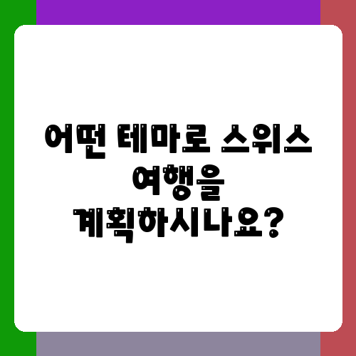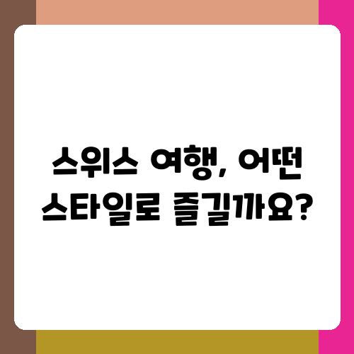 스위스 여행은 다양한 스타일로 즐길 수 있어요. 럭셔리한 호텔에서 숙박하며 편안한 여행을 즐길 수도 있고, 자연 속에서 캠핑을 하며 모험적인 여행을 즐길 수도 있답니다. 또한, 자동차를 렌트하여 자유롭게 여행을 즐길 수도 있고, 기차를 이용하여 편리하게 여행을 할 수도 있지요. 어떤 스타일을 선택하든, 자신의 여행 스타일에 맞춰 계획을 세우는 것이 중요해요. 스위스 여행은 단순히 여행이 아니라, 추억을 만들고 자신을 재충전할 수 있는 소중한 시간이 될 거예요. 여러분에게 맞는 여행 스타일을 선택하고, 스위스의 아름다움을 마음껏 느껴보세요! 잊지 못할 추억을 만들 수 있도록, 저는 여러분의 스위스 여행을 응원합니다!