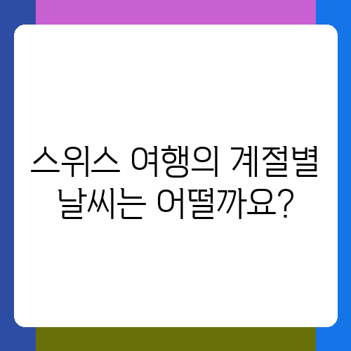 스위스는 고산 지대이기 때문에 지역에 따라 기온 차이가 크다는 점을 먼저 알려드릴게요. 일반적으로 봄(4월-5월)에는 겨울의 흔적이 남아있지만, 점차 따뜻해지면서 녹색의 자연이 눈에 띄기 시작해요. 여름(6월-8월)은 맑고 따뜻하지만, 고지대에서는 갑작스러운 소나기가 내릴 수 있으니 우산을 준비하는 것이 좋답니다. 가을(9월-10월)은 단풍이 아름다워 사진 찍기 좋은 계절이에요. 낮에는 따뜻하지만, 아침 저녁으로는 기온이 떨어지니 겉옷을 준비하세요. 겨울(11월-3월)에는 눈이 많이 내리며 스키와 스노보드를 즐기기에 최고의 시기랍니다. 하지만, 겨울철에는 일부 지역의 접근이 어려울 수 있으니 미리 확인하는 것이 중요해요. 저는 개인적으로 봄과 가을의 스위스가 특히 아름답다고 생각해요. 맑은 날씨와 함께 녹음과 단풍의 아름다움을 만끽할 수 있거든요.