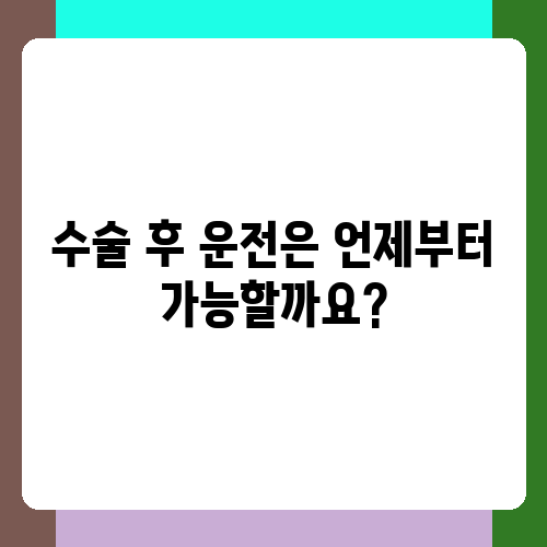 수술 후 운전은 시력 회복 상태에 따라 다르게 결정됩니다. 보통 수술 후 며칠 또는 몇 주 이내에는 시력이 완전히 회복되지 않기 때문에 운전을 해서는 안 됩니다. 의사 선생님께서 운전 가능 여부와 시기를 정확하게 알려줄 거예요. 운전을 하기 전에 시력이 충분히 회복되었는지 꼭 확인해야 하고, 야간 운전은 시야가 제한될 수 있으니 주의하는 것이 좋습니다. 운전 외에도 수술 후에는 격렬한 운동이나 무거운 물건을 드는 행위 등 눈에 무리가 갈 수 있는 활동은 피하는 것이 중요합니다. 회복 과정에서 충분한 휴식을 취하고, 눈에 부담이 되는 행동을 삼가는 것이 빠른 회복에 도움이 될 거예요. 저는 수술 후 한 달 동안은 운전을 하지 않았고, 가벼운 산책 정도만 했답니다.