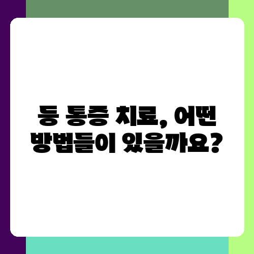 등 통증 치료는 원인과 증상의 정도에 따라 다릅니다. 가벼운 근육통의 경우에는 휴식, 스트레칭, 진통제 복용으로 증상 완화가 가능합니다. 하지만 심한 통증이나 디스크 문제가 의심되는 경우에는 물리치료, 약물치료, 수술 등의 다양한 치료 방법이 고려될 수 있습니다. 물리치료는 근육의 긴장을 완화하고 통증을 줄이는 데 도움이 되며, 약물치료는 통증과 염증을 감소시키는 효과가 있습니다. 심한 경우에는 수술이 필요할 수도 있지만, 수술은 최후의 수단으로 고려되어야 합니다. 전문의와 상담하여 자신에게 적합한 치료 방법을 선택하는 것이 중요합니다. 각 치료법의 장단점을 비교하고, 나에게 맞는 치료법을 선택하기 위해 충분한 상담을 받으세요.