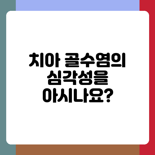 치아 골수염은 치아의 신경과 혈관이 있는 치수(골수)에 심각한 감염이 발생한 상태입니다. 단순한 치통으로 시작해서 방치하면 턱뼈까지 염증이 번질 수 있으며, 심각한 경우에는 패혈증으로 이어질 수도 있다고 합니다. 처음에는 찌릿한 통증으로 시작하지만, 시간이 지날수록 통증의 강도가 점점 심해지고 밤에도 잠 못 이룰 정도로 고통스러워진다고 합니다. 단순한 치통으로 생각하고 방치하다가는 치료 시기를 놓쳐 더 큰 고통을 겪을 수 있으니, 치통이 오래 지속된다면 병원을 방문하는 것을 미루지 마세요. 자신의 치아 건강을 위해 꼼꼼하게 체크해보시고, 혹시라도 해당 증상이 나타난다면 즉시 치과 진료를 받는 것이 가장 중요합니다. 빠른 진단과 치료는 치료 기간 단축과 더 나아가 건강 유지에 큰 도움이 됩니다.